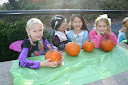 Decorations combined my idea of “Let’s decorate with costumes!” with my mom’s “Do you want me to bring some pumpkins?” So the answer was obvious–let’s dress the pumpkins up in costume! I don’t have any pictures, it seems, but I did get some of the pumpkins the kids painted. =)